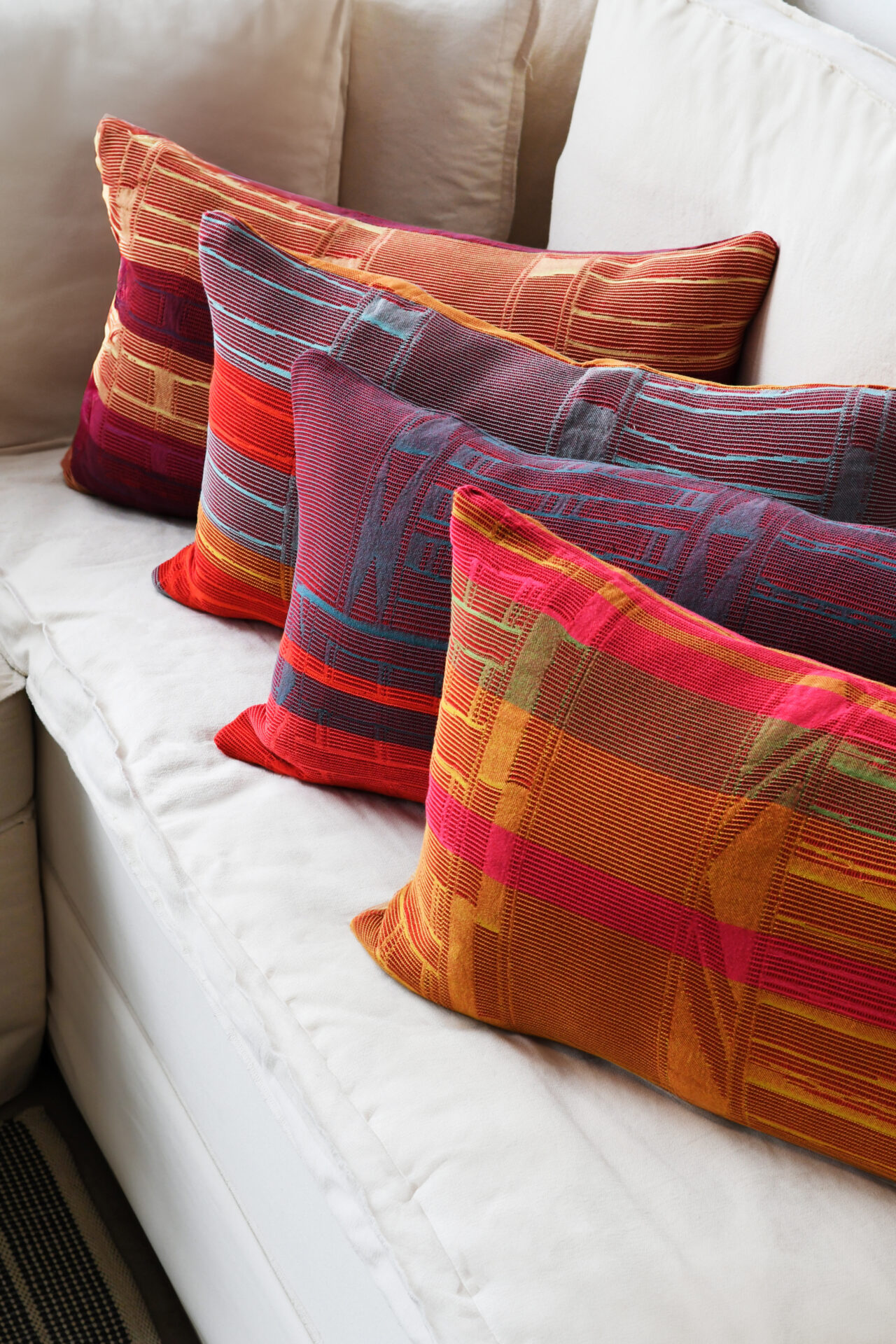 Jacquard woven from 100% French linen, you’ll find the geometric designs, inspired by the Bogolan designs of West Africa, pop against the honeycomb pattern. Geometric beauty in your living area!