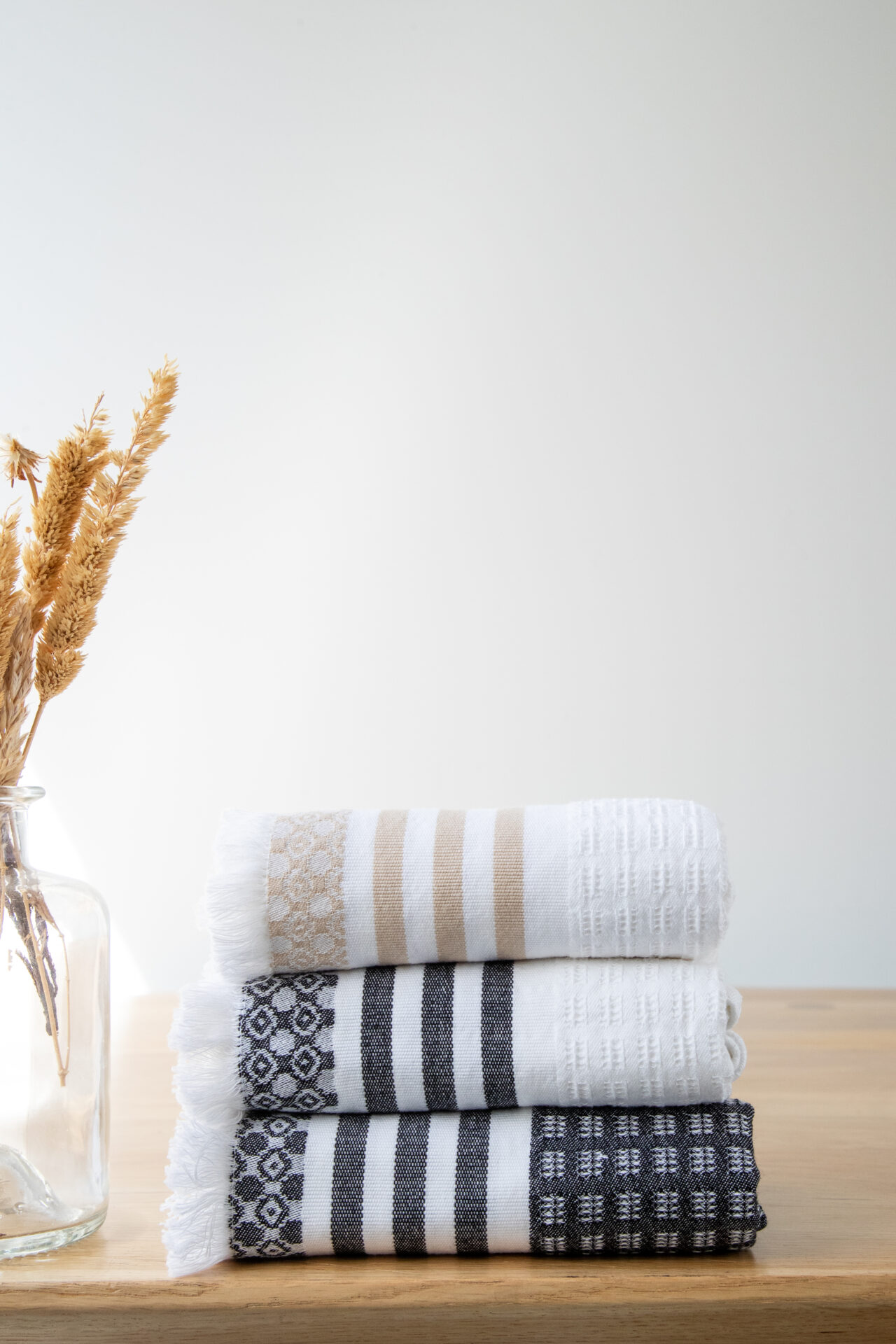 Our Kuba Summer beach towels are inspired by the Kuba designs found in Congolese Fabrics. They are Jacquard woven with a honeycomb weaving pattern mixed in with striking geometric designs. Versatile and lightweight, our Kuba towels will keep you dry when used at home, at the beach or around the pool.